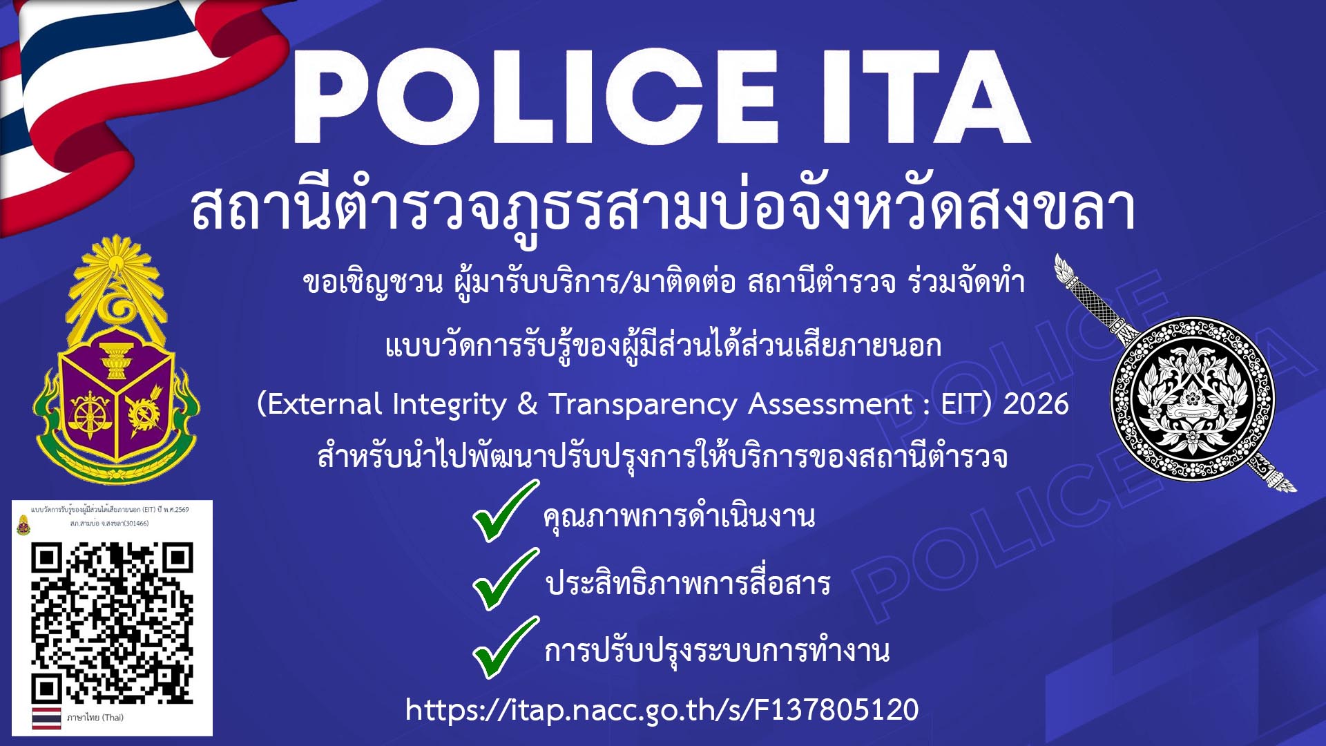 ประชาสัมพันธ์ข้อมูลการประเมินคุณธรรมและความโปร่งใสในการดำเนินงานของหน่วยงานภาครัฐ (Integrity & Transparency Assessment : ITA) ของสถานีตำรวจภูธร ประจำปีงบประมาณ พ.ศ.2569