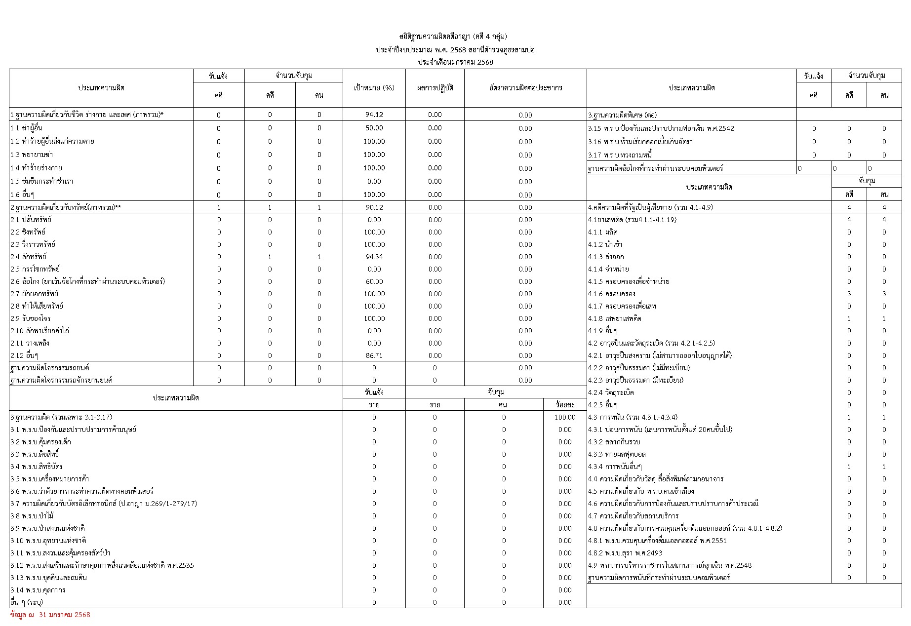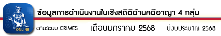 สถิติด้านคดีอาญา 4 กลุ่ม ตามระบบ CRIMES ประจำเดือน มกราคม 2568 4 กุมภาพันธ์ 2025 โดย admin / O11.สถิติผลการดำเนินงาน,สถิติด้านคดีอาญา