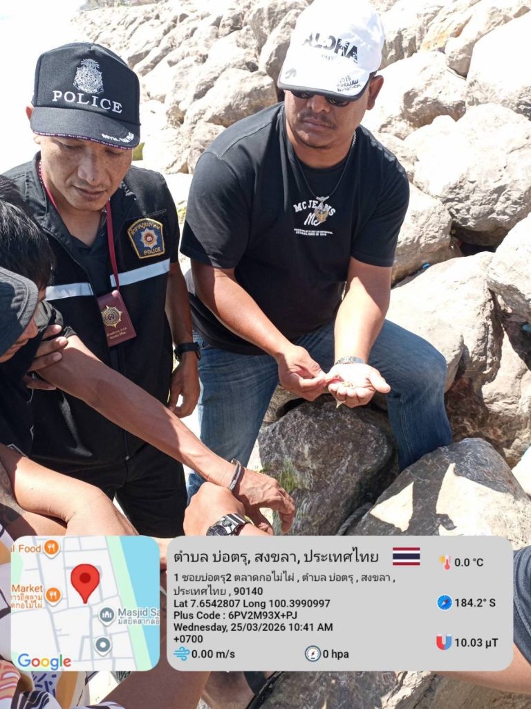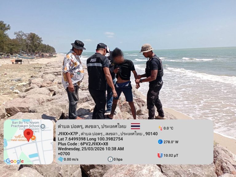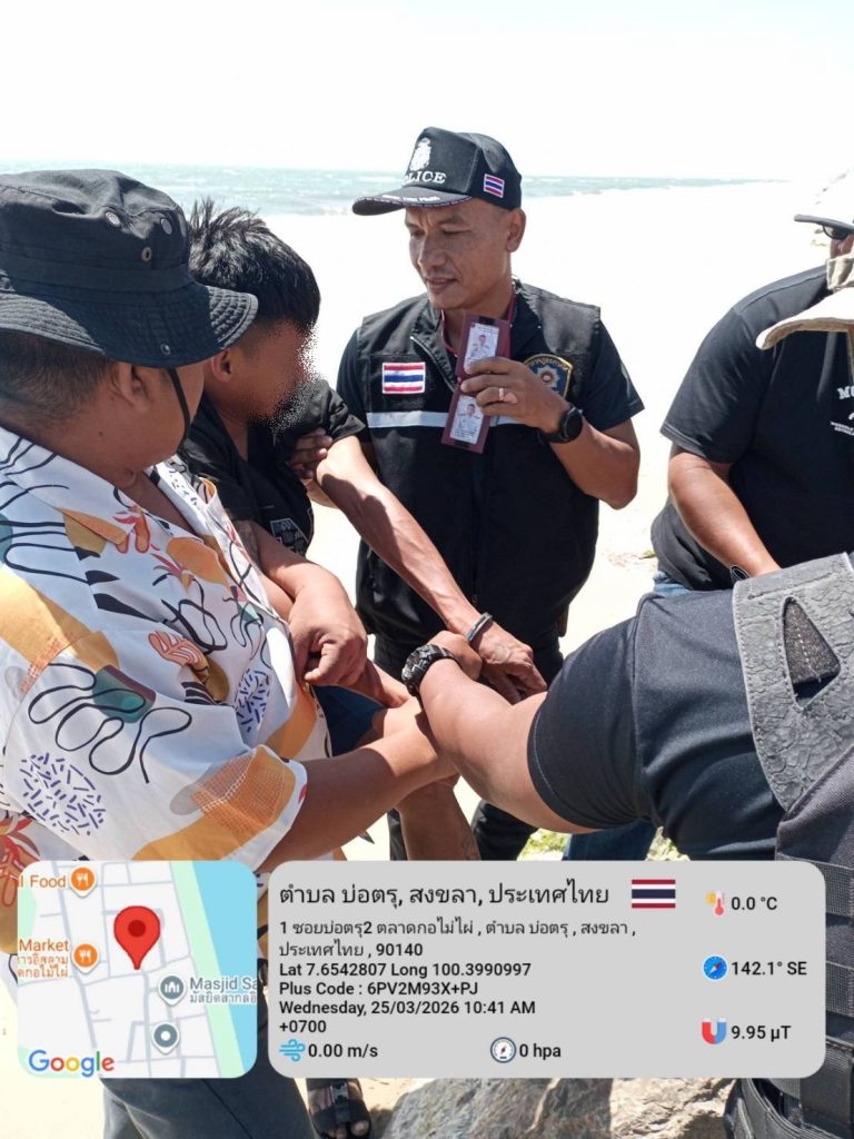 วันพุธที่ 25 มีนาคม 2569 เวลา 10.30 น. ร.ต.อ.สุนทร แช่มช้อย รอง สว.สส.สภ.สามบ่อ พร้อมด้วย เจ้าหน้าที่ตำรวจ สภ.สามบ่อ ได้ออกตรวจพื้นที่เมื่อมาถึงบริเวณชายทะเลอ่าวไทย ม.๑ ต.บ่อตรุ อ.ระโนด จ.สงขลา พบผู้ต้องสงสัย ยืนอยู่บนชายหาดใกล้แนวโขดหินกันคลื่น เป็นบุคคลที่เกี่ยวข้องกับยาเสพติด เจ้าหน้าที่ตำรวจจึงได้ขอทำการตรวจค้น พบยาบ้าจำนวน ๘๘ เม็ด เจ้าหน้าที่ตำรวจจึงทำการตรวจยึดของกลาง นำตัวผู้ถูกจับมาที่ สภ.สามบ่อ เพื่อดำเนินการตามกฎหมายต่อไป