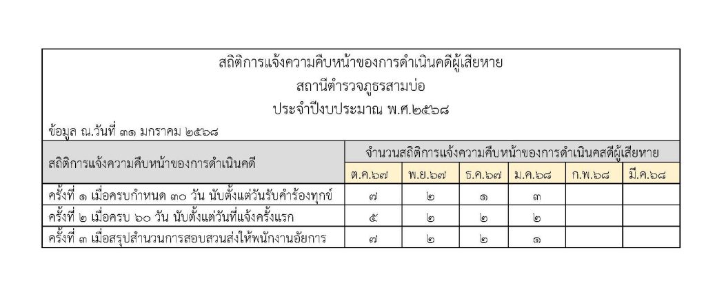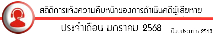 สถิติการการแจ้งความคืบหน้าของการดำเนินคดีผู้เสียหาย ประจำเดือนมกราคม 2568 4 กุมภาพันธ์ 2025 โดย admin / O11.สถิติผลการดำเนินงาน,การดำเนินคดีผู้เสียหาย
