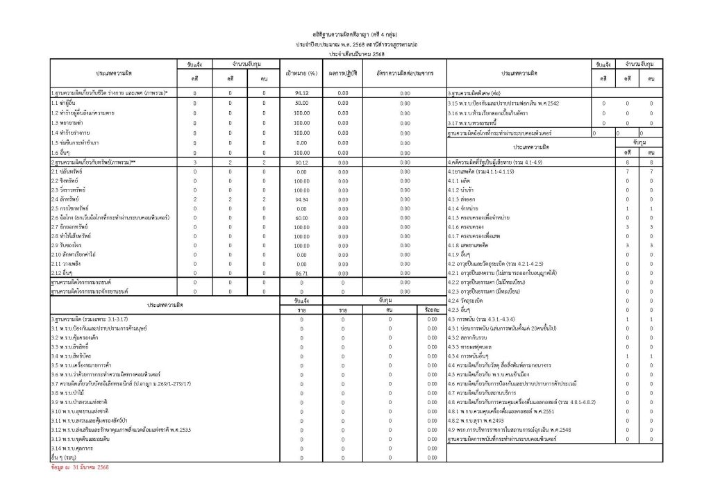สถิติด้านคดีอาญา 4 กลุ่ม ตามระบบ CRIMES ประจำเดือน มีนาคม 2568 1 เมษายน 2025 โดย admin / O11.สถิติผลการดำเนินงาน,สถิติด้านคดีอาญา