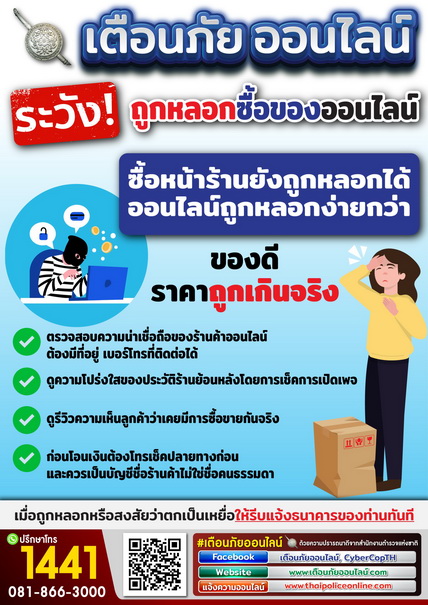 8 กลุ่มกลโกงที่คนร้ายใช้จุดอ่อนของเหยื่อเพื่อหลอกลวง 22 พฤศจิกายน 2023 โดย admin / ข่าวประชาสัมพันธ์,ประชาสัมพันธ์ข่าวสาร 1. สร้างความเชื่อถือก่อนหลอกลวง 2.ขู่ให้กลัวว่ามีความผิด 3.รู้ไม่ทันเทคโนโลยี 4.ลวงให้โลภ ตกทองยุคไอที 5.หลอกหารายได้ออนไลน์ 6.หลอกให้รักแล้วลงทุน 7.หลอกให้กู้เงินแต่เสียเงิน 8.รับจ้างเปิดบัญชีม้า แหล่งที่มา : เตือนภัยออนไลน์.com