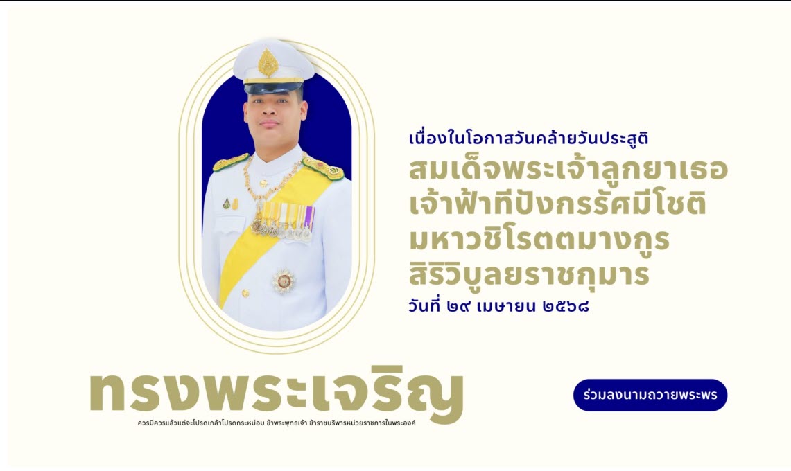 ลงนามถวายพระพร สมเด็จพระเจ้าลูกยาเธอ เจ้าฟ้าทีปังกรรัศมีโชติ มหาวชิโรตตมางกูร สิริวิบูลยราชกุมาร 29 เมษายน 2568 28 เมษายน 2025 โดย admin